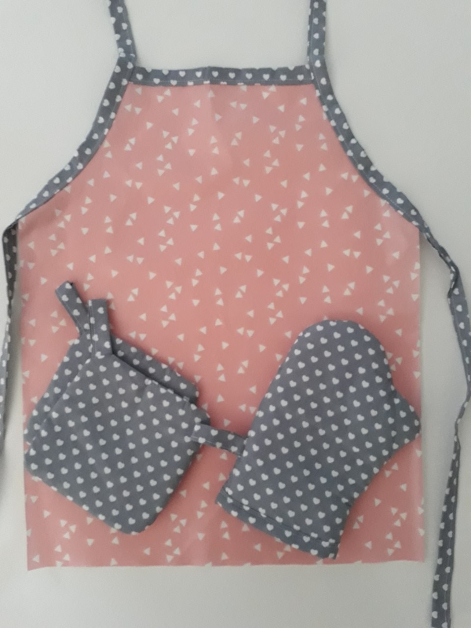 Het roze met grijze keukensetje is gemaakt van geplastificeerd katoen, de bies, de ovenwant en de pannenlappen zijn gemaakt van katoen.